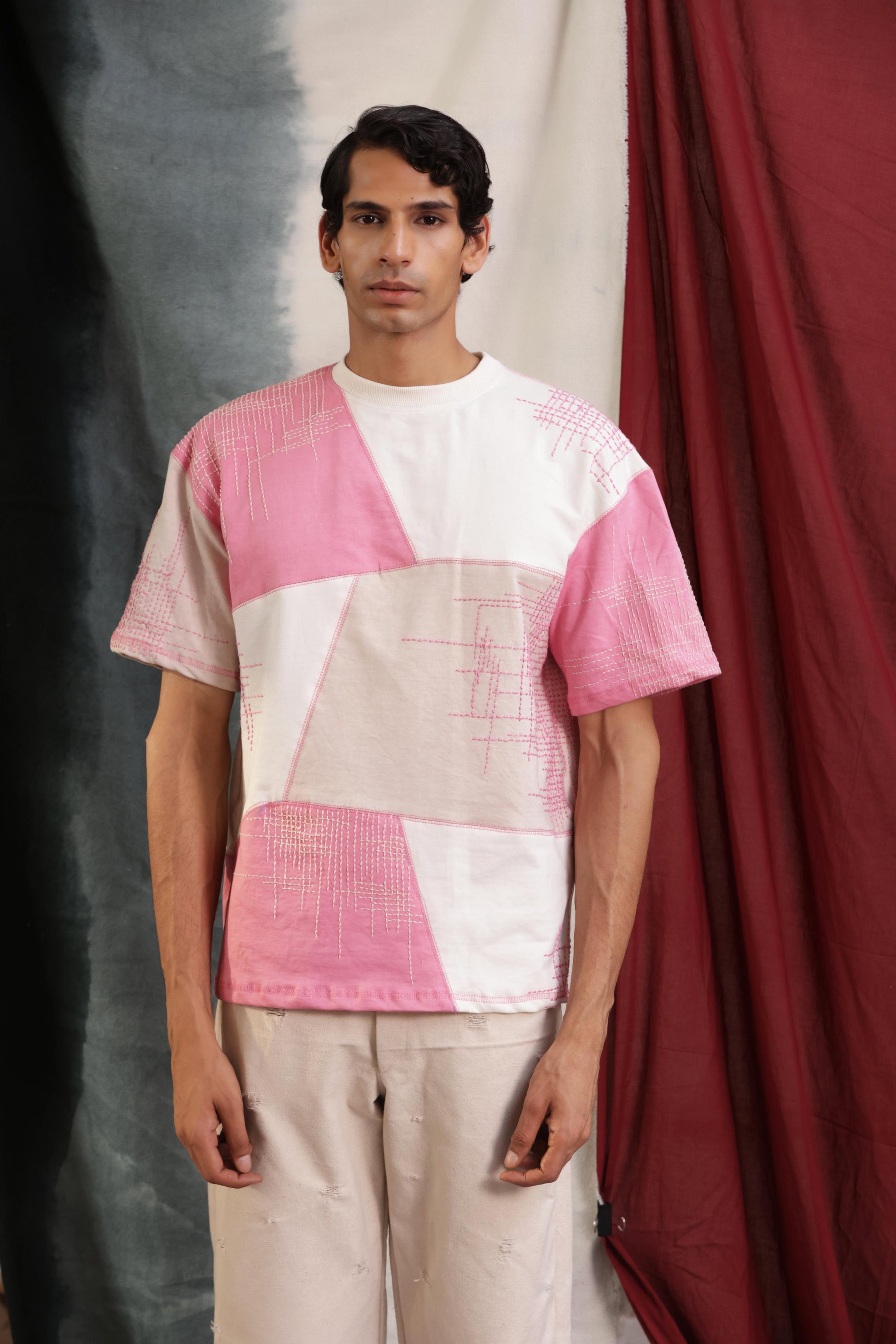Handcrafted with precision, the Gulabi Rekha tee features intricate contrast thread work that adds depth to its geometric pink patterns. The artisanal handwork and patchwork design create a unique blend of tradition and modern streetwear, making it a statement piece for those who value craftsmanship and style.