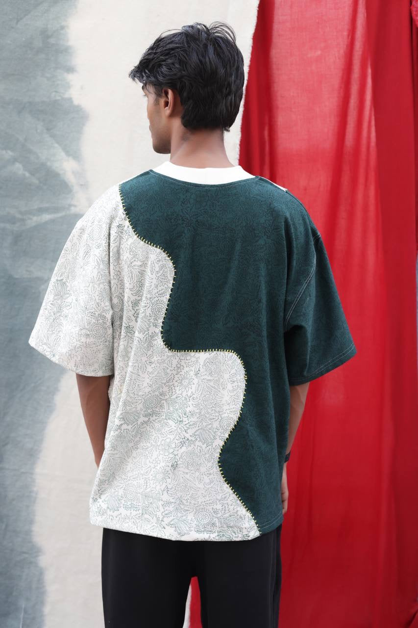 Embrace the blend of tradition and elegance with our Green-White Fusion T-shirt. This half white, half green masterpiece features block printing by a 7th generation artisan, keeping ancient craftsmanship alive. The yellow embroidery stitch dividing the t-shirt provides a vibrant highlight, making this t-shirt a standout piece.